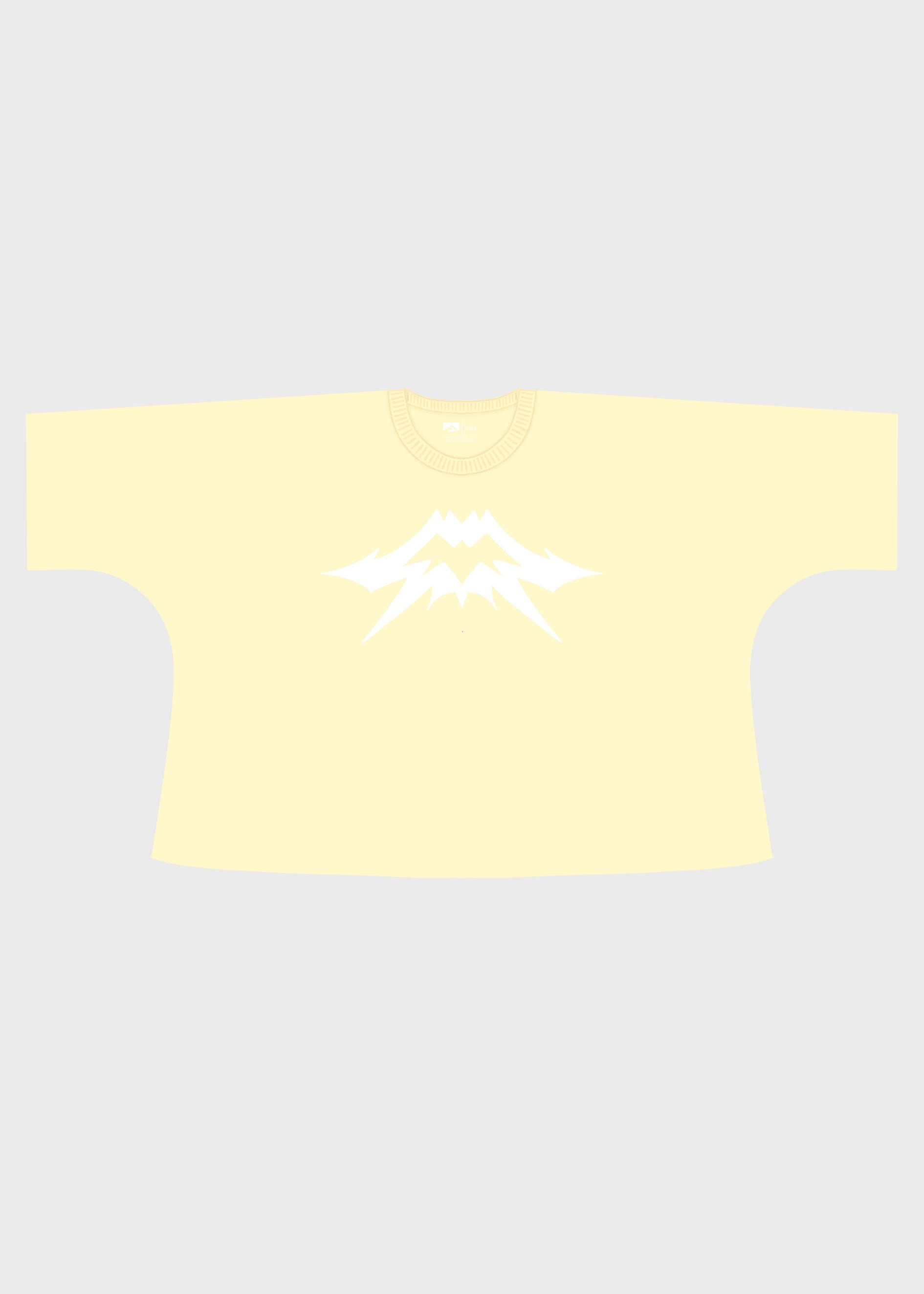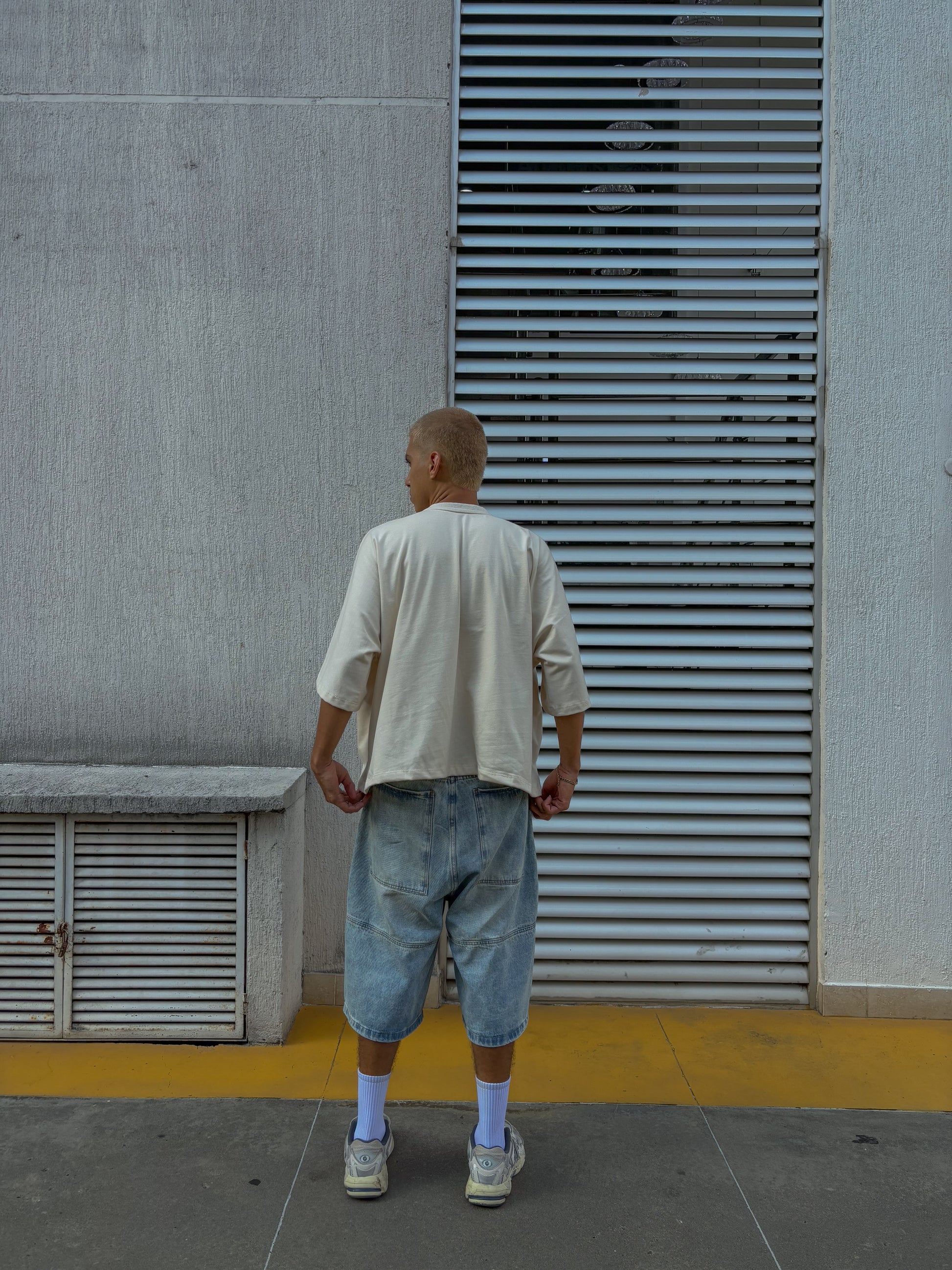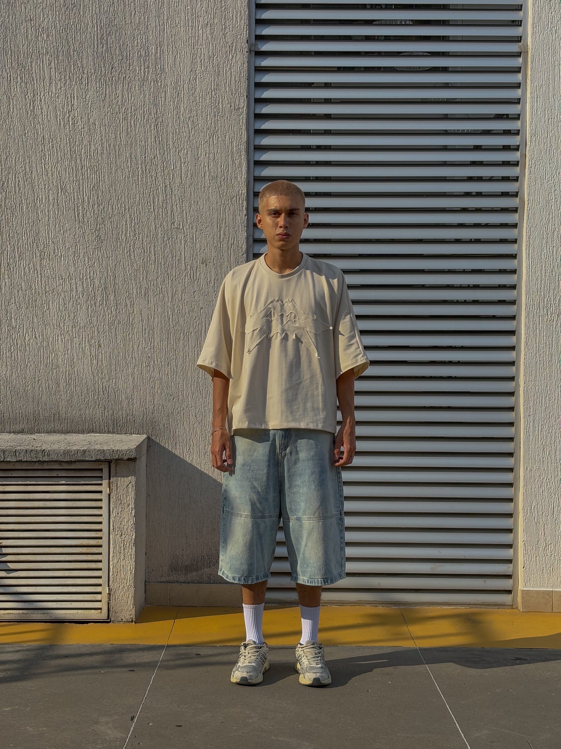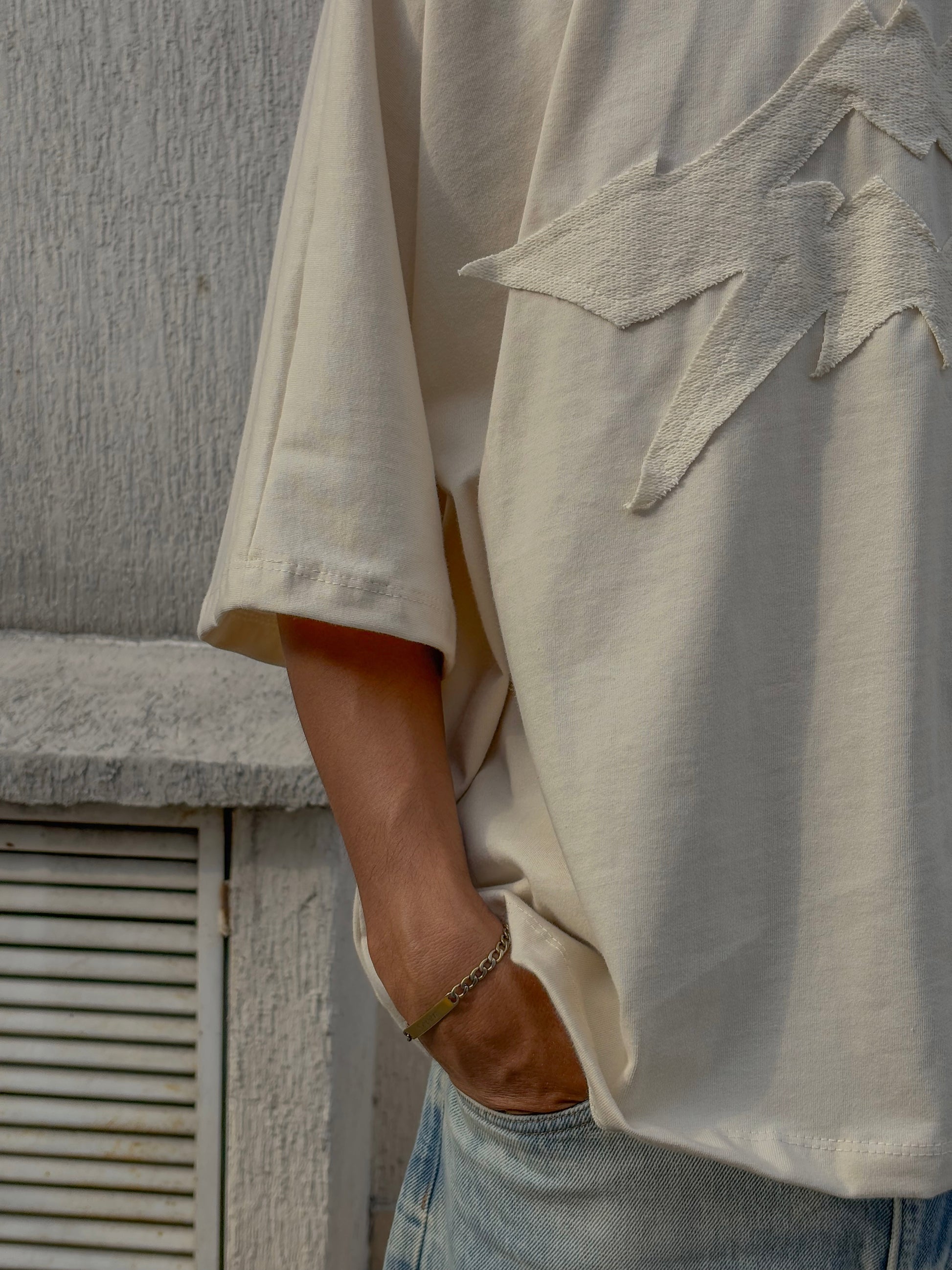 Camiseta color Crema con horma fuera de lo común, elaborada en tela 100% algodón de alto gramaje (240gr), con pieza grafica en tela cosida en frente. - Unisex - El modelo mide 1,79 y usa talla L-XL